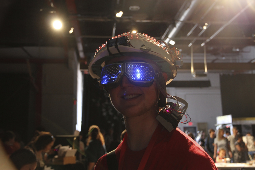 Goggles part III. This photo was taken at the 2011 Maker Fair. I’m driving the matrix with a PIC18F66J60 and some 74HC164 shift registers located in a box at the back of my head. Also wearing an unrelated LED matrix colander hat that will be documented sometime later.