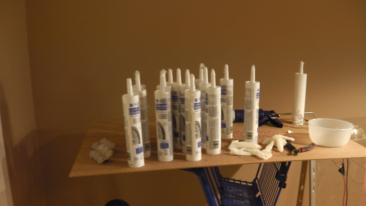 After installing all the diffusers and LED circuit boards on the shopping cart I find myself with a dozen empty caulking gun silicone tubes. These things look really cool if you sand the labeling off and add LEDs. I think I’ll hold on to them and make glowing shoulder spikes. I can’t get too distracted now though, there’s lots more work to do on the shopping cart.