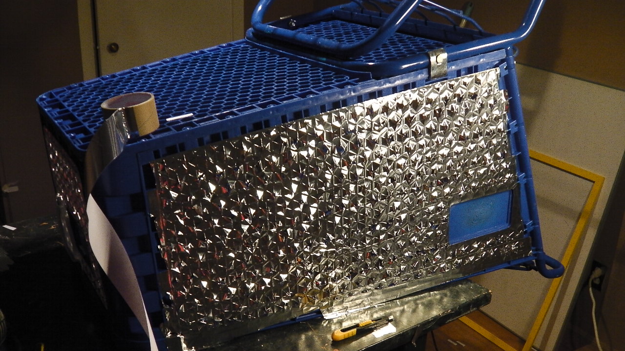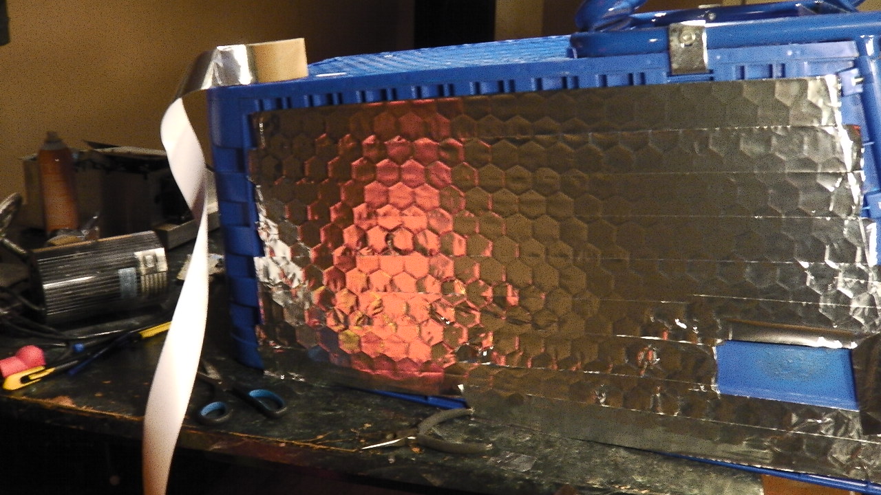 It was a dark blue shopping cart, so before installing the LED boards I covered the cells with reflective aluminium tape. This makes the lights brighter.