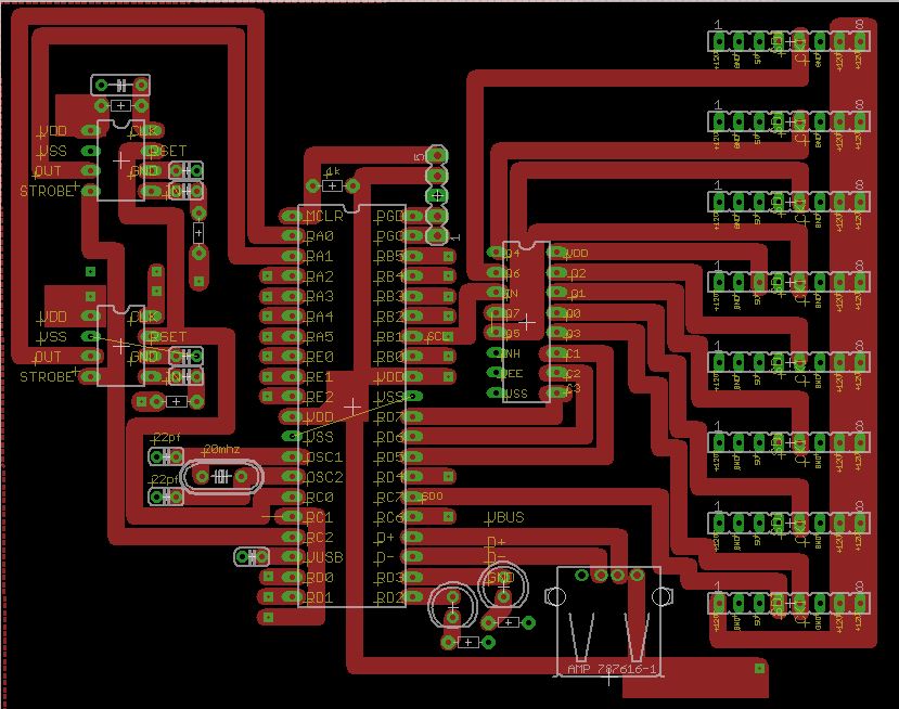 For redundancy each board can control its LEDs independent of any connection to external software. I’m adding a pair of MSGEQ7 ICs to help generate sound responsive visuals. These are analog frequency response ICs that give the PIC18F4550 the amplitude of seven individual audio frequency ranges on both the right and left audio channels.