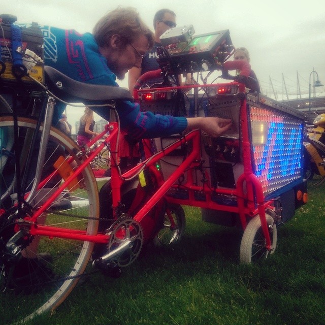 I welded bike forks to the shopping cart to hold pneumatic 12.5″ bicycle wheels, and installed a 22″ bike frame to the rear end. I also added additional cross pieces to the bottom because I needed a place to attach caliper brakes. Wheels go under the cart instead of the sides so they don’t obstruct the LED panels.