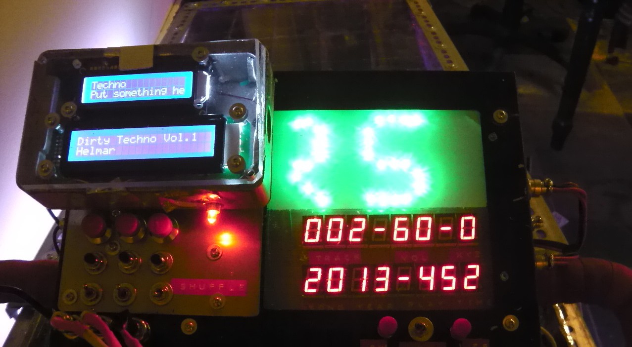 I wanted an interesting Doc-brown style display of the ID3 tag information. This was built into an industrial electronic case. A large green 8*16 LED matrix scrolls the song title. 7-segment displays show the song year, remaining play time, volume, and track number. The two LCD displays give Song Genre, artist, album name, and system status.